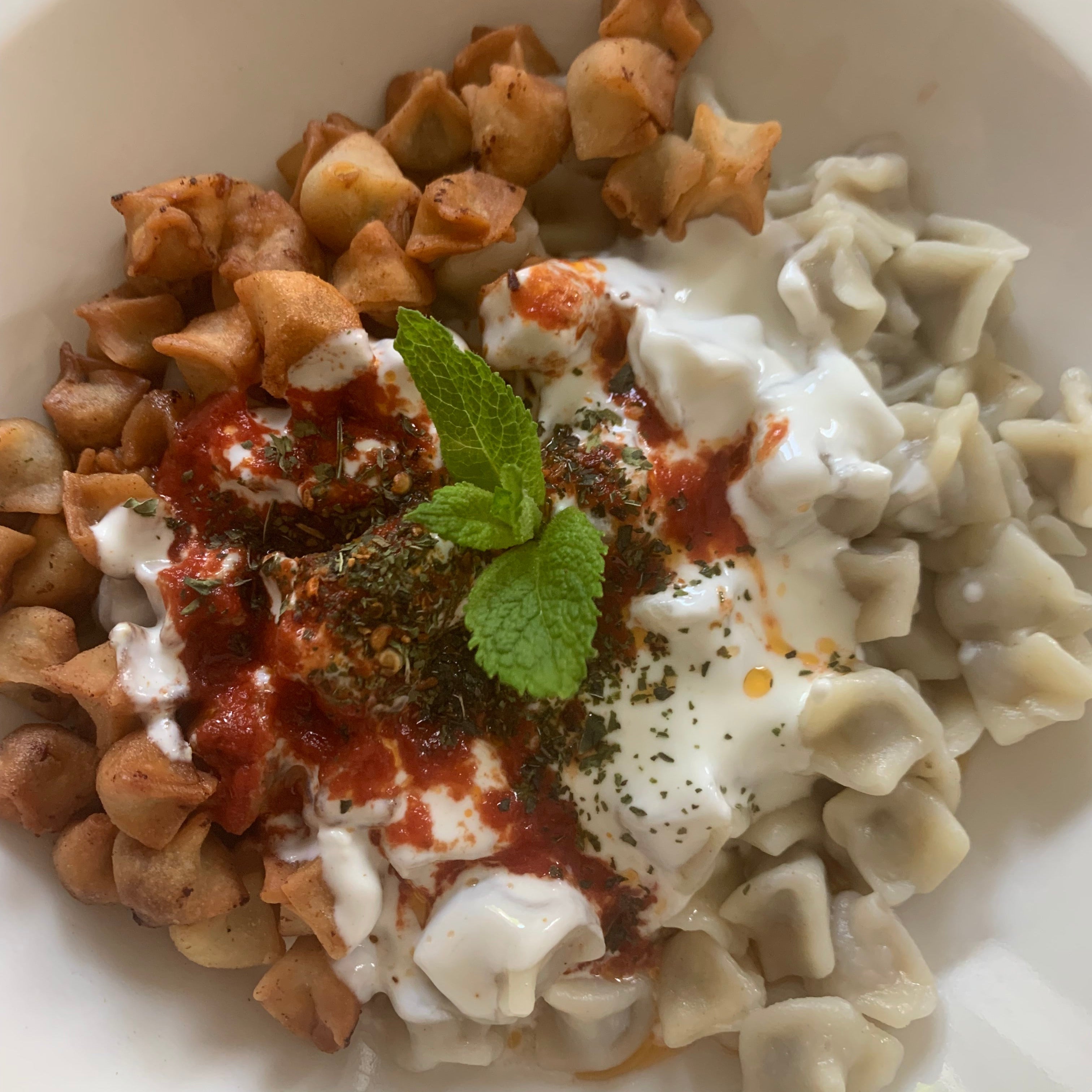 We once made manti at home to see how much effort it takes to make it. First you prepare the dough, then roll it, cut into small pieces, then comes the longest part.. You fill in each little square with a tiny bit of meat and close. This can take hours and hours to do. It literally took us 3/4 hours to make about 3 bowls of manti! But it turned out to be delicious, and our little family spent some quality times together.. Will we do it again? No way!